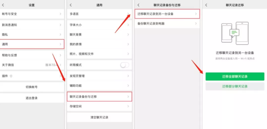 这个操作同样需要两台设备连在同一个WiFi上。打开原手机的微信,点“我”——“设置”——“通用”——“聊天记录备份与迁移”——“迁移聊天记录到另一台设备”,生成二维码。在新设备上登录微信并扫码,就可以开始迁移了。