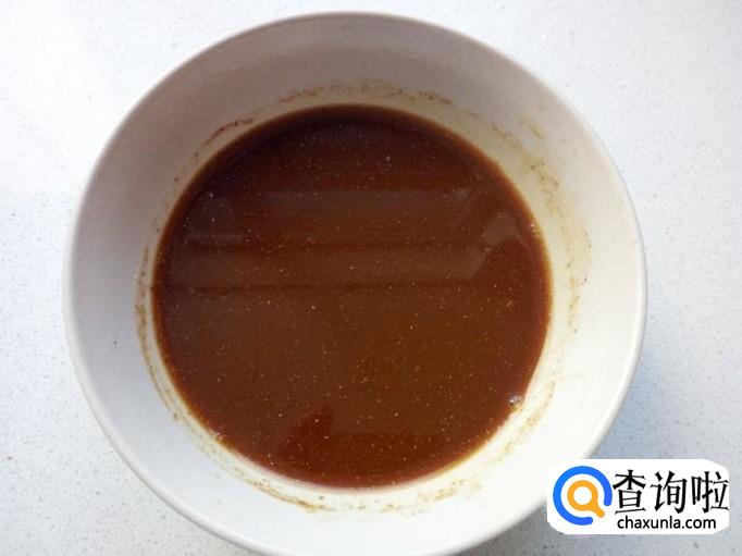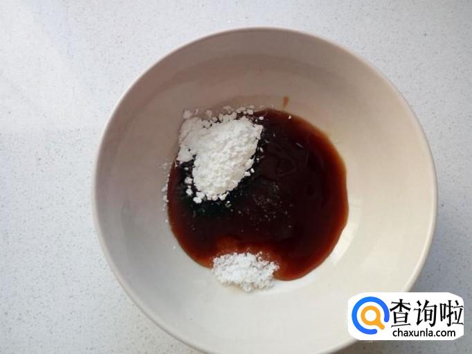 碗里放入两匙儿耗油,少许酱油,白糖,五香粉,一匙儿淀粉,兑水,勾兑成耗油料汁(耗油里含有盐成分,不用放盐,而且味道鲜香,所以不用放入其它调料,可以根据个人喜好,适量添加调料,我放了少许五香粉)。