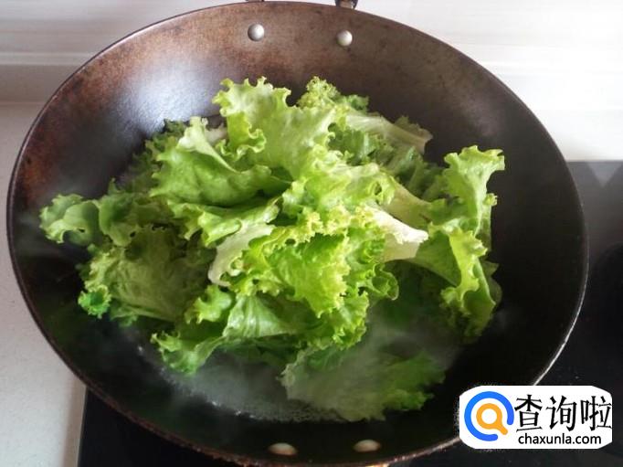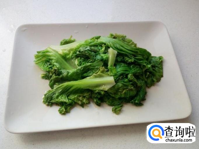 把洗好的生菜放入开水中汆一下,入锅几秒钟即捞出,沥干水分(不要用冷水过凉)。