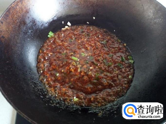 把勾兑好的耗油汁倒入锅中,小火慢熬(用勺搅合均匀)。