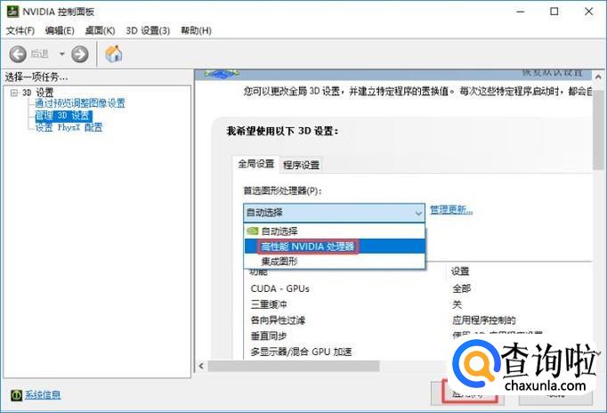 弹出的界面,我们点击选择高性能NVIDIA处理器,之后我们点击应用,这样就可以提高游戏性能了。