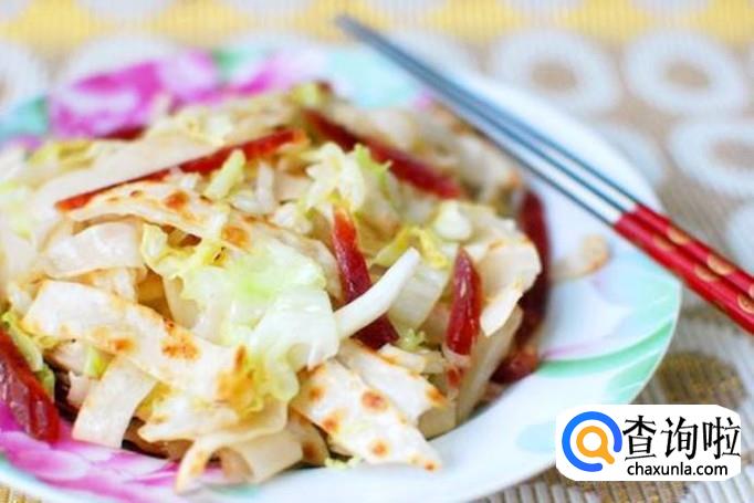 饺皮和香肠都切成细长条,包菜洗净后用手掰成小片。油锅烧热,把包菜片和香肠条放入锅中,大火煸炒1分钟左右,放入切成细长条的饺皮,大火炒匀,加入少许生抽和盐,再加入少许水,中火煮至汤汁渐渐收干时,加入少许味精,翻炒均匀即可出锅装盘了。