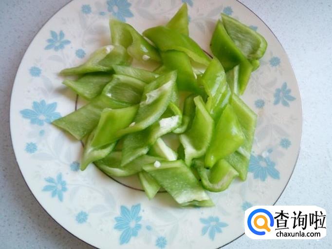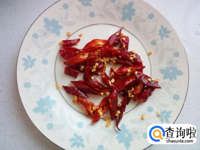 青尖椒用水清洗干净,控干水分,切成菱形片。每个红干椒斜刀切成三段,备用。