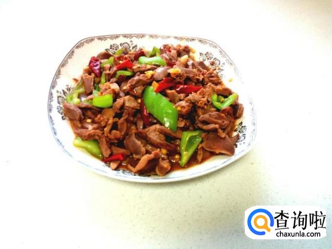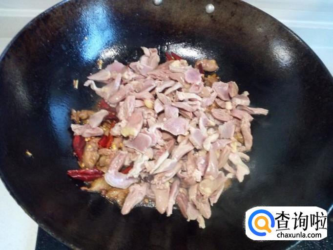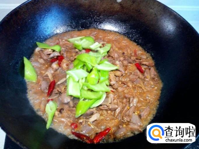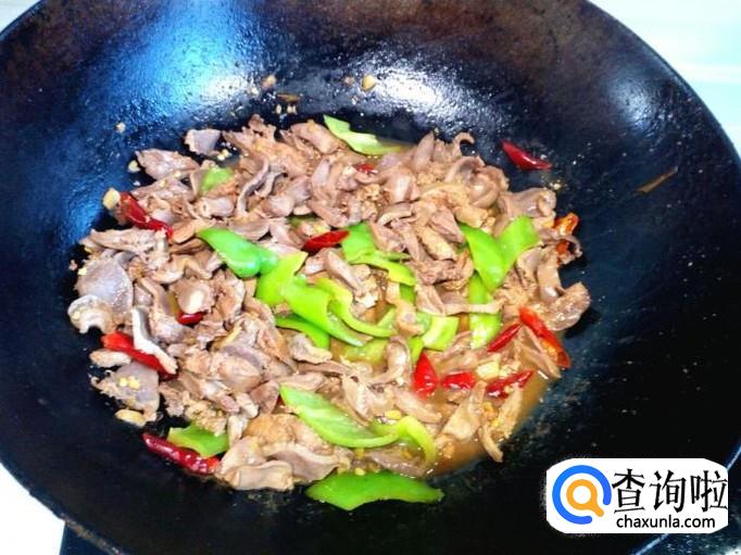 炒至鸡心,鸡胗,完全变成微白色,没有粉肉色后,放入青尖椒,略翻炒一下。放入勾兑好的芡汁,芡汁粘稠后,放入味精,关火出勺。