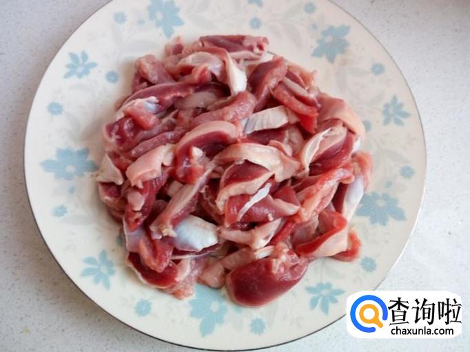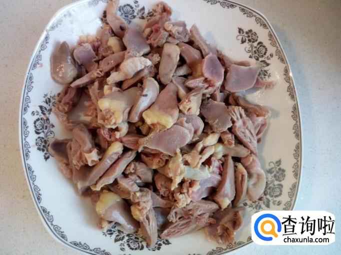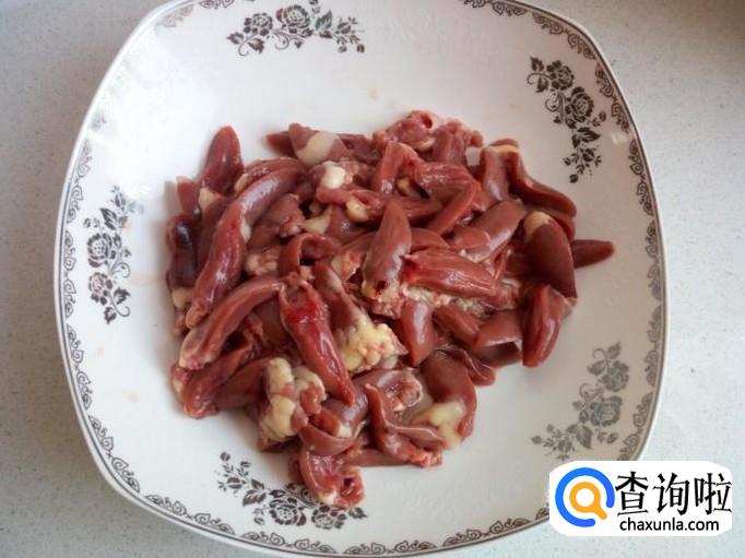 鸡胗用水清洗干净,控干水分,切成片(大小和鸡心接近)。
