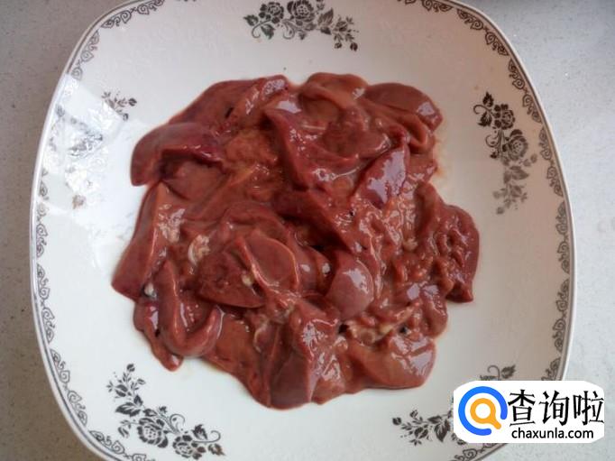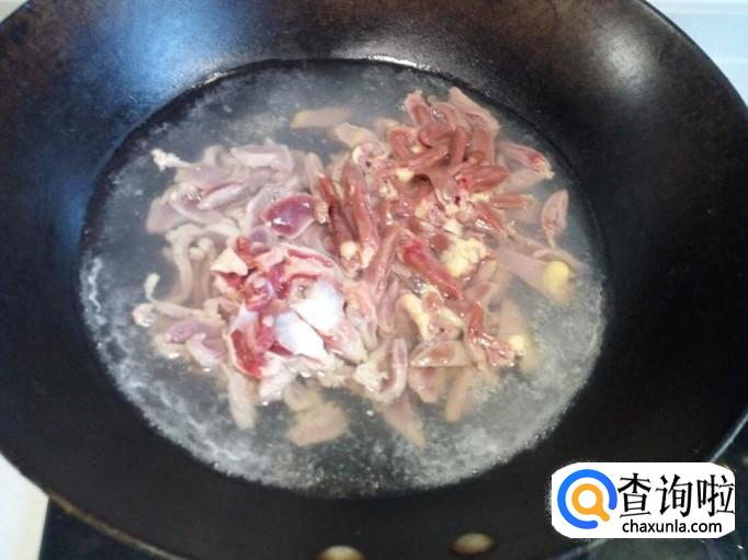 把鸡心,鸡胗,用开水汆一下,入锅几秒钟即捞出,立即用冷水过凉,沥干水分。鸡肝不用焯,因为焯过水的鸡肝,入锅炒,容易碎。