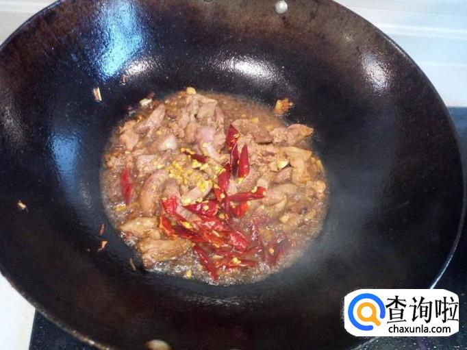 炒至鸡肝表面坚挺后,放入红干椒翻炒,随即放入鸡心,鸡胗翻炒,放入盐。