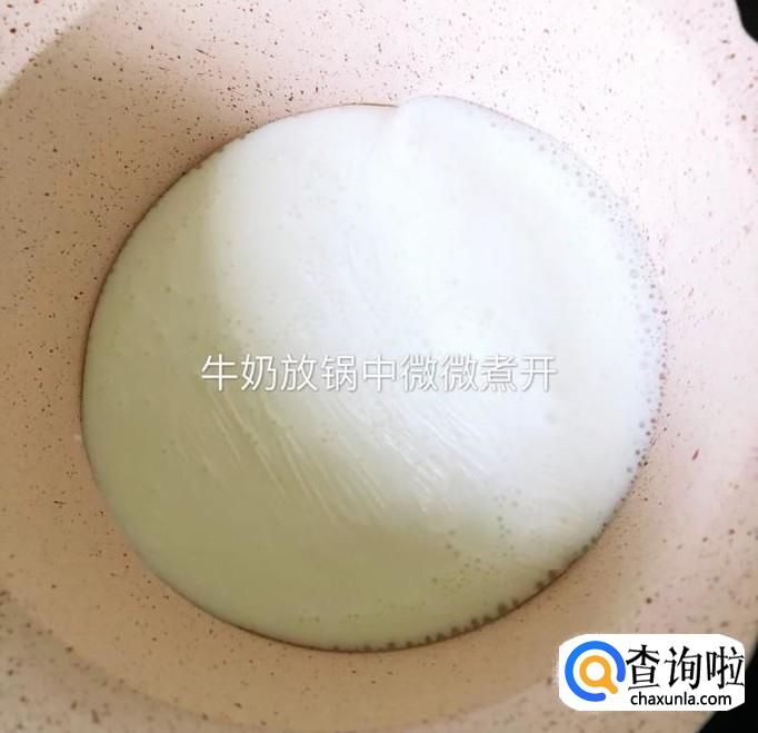 然后将牛奶加入锅中,煮至微开,如下图所示。