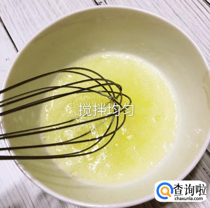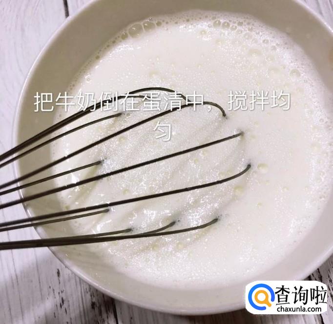接着把煮开的牛奶倒入蛋清中,搅拌均匀,如下图所示。