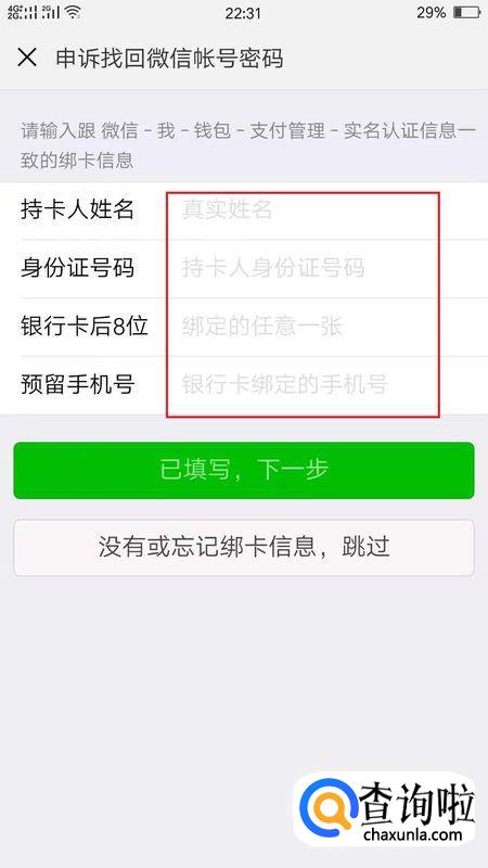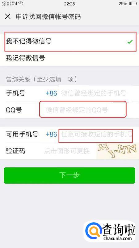 进入以后,若不记得微信号,选择我不记得微信号一项,因没有绑定手机号,所以曾绑关系里需要输入QQ号,然后在可用手机号里输入新的手机号码,点击下一步进入。
