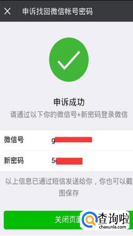 通过以后就申诉成功,获取了微信号和新密码,即可用新密码登录微信。