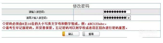 首次登录网上报名系统,系统会跳转至修改密码界面,密码必须由8至16位的大小写英文字母和数字组成,不能包含特殊字符或其它字符,例如:ABC123abc。请考生牢记新密码,并妥善保管,忘记密码可凭报名时填写的手机号码重置,也可到学校或者县区招办进行密码重置。