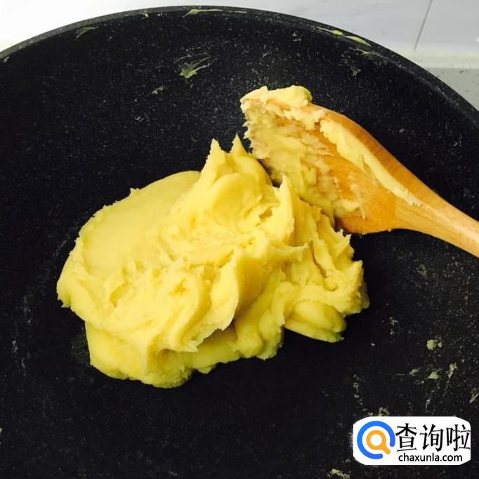 取一个平底锅,平底锅烧干后将绿豆沙放入煎至略微的干透,变成绿豆泥,放凉后捏成你想要的形状。