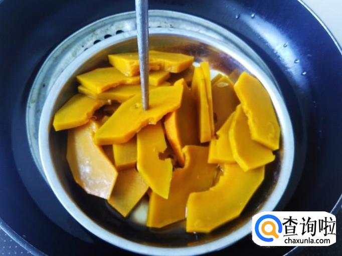 然后打开,用筷子插入南瓜片,很容易就插穿就是熟透了。
