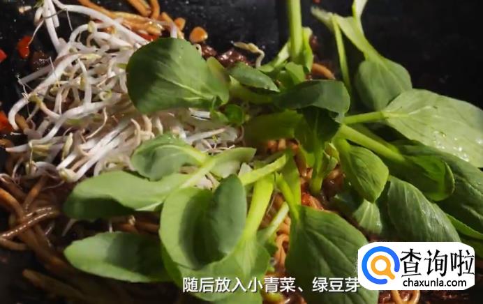 之后再将米粉倒入翻炒,淋上酱油,随后放入青菜和豆芽,炒至断生。