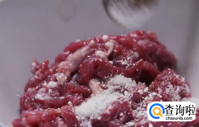 之后将洗净的牛肉切丁,用红薯粉和盐抓匀。