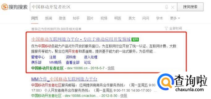 首先,我们使用搜索引擎搜索“中国移动开发者社区”或“中国移动互联网能力平台”关键字(两者都是一个意思),在搜索结果中打开中国移动互联网能力平台。