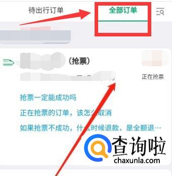 进入“订单”页面,然后在订单界面上方点击选择“全部订单”,随后点击“正在抢票”的订单。