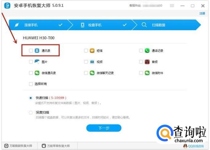 接着软件识别连接到已经root过的金立手机,并且显示如下界面,选择自己要恢复的联系人,也就是勾选通讯录。