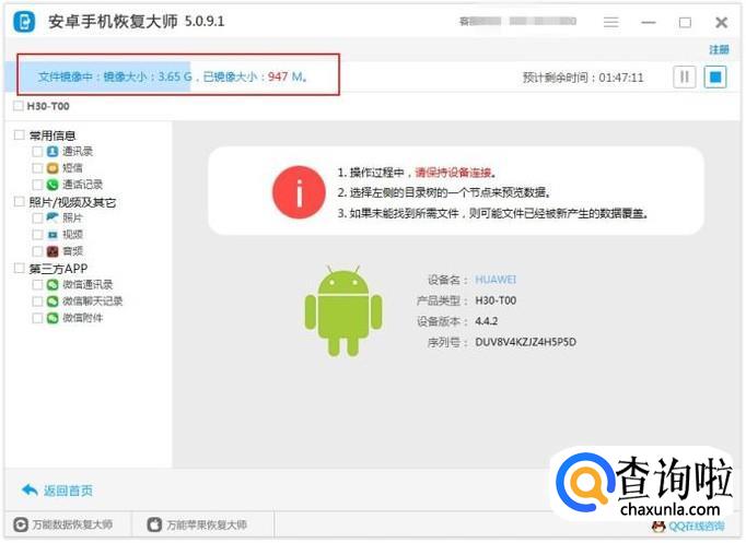 点击下一步,进入镜像和扫描过程。在这一过程中可能需要耐心等待,而且尽量不要操作手机,避免扫描被中断。