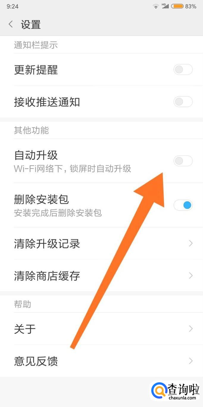 最后关闭“自动升级”选项即可避免手机在后台下载应用更新安装包。