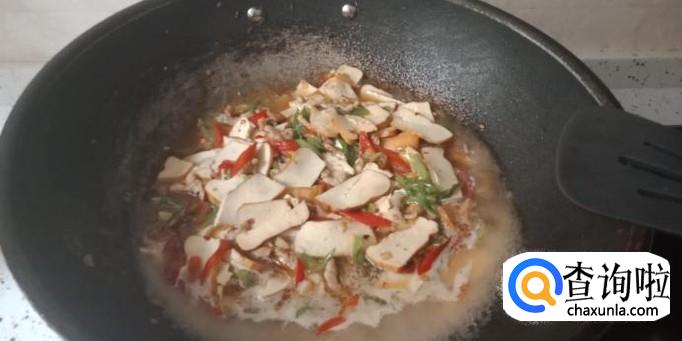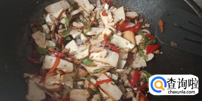 这个时候香干和肉,辣椒已经炒熟了,此时就能往锅里面加点水,水差不多干了之后加上鸡精即可,美味可口的香干肉丝就做好了。