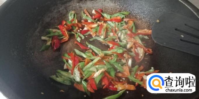 还是起锅放油,先把大蒜放在锅里,等到炒出来香味之后,就能把青红椒放入锅里炒,如果喜欢吃辣的,辣椒炒一会就好,当然要是不喜欢吃辣,时间可以稍微长点。