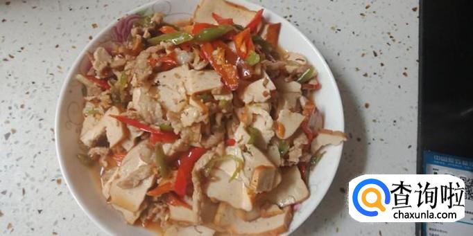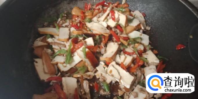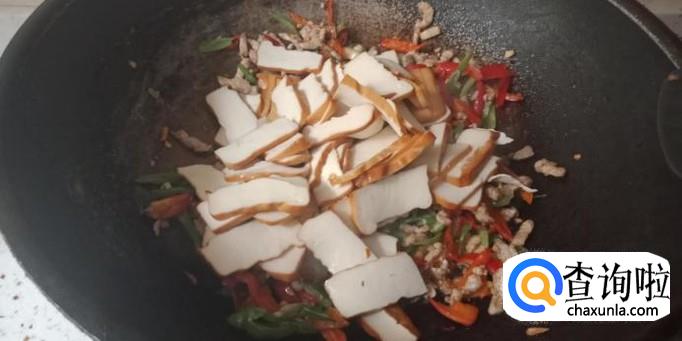 等到肉和辣椒炒的差不多了,这个时候就能放香干进去,炒了一小会再加入食盐和耗油,一直炒到香味出来即可。