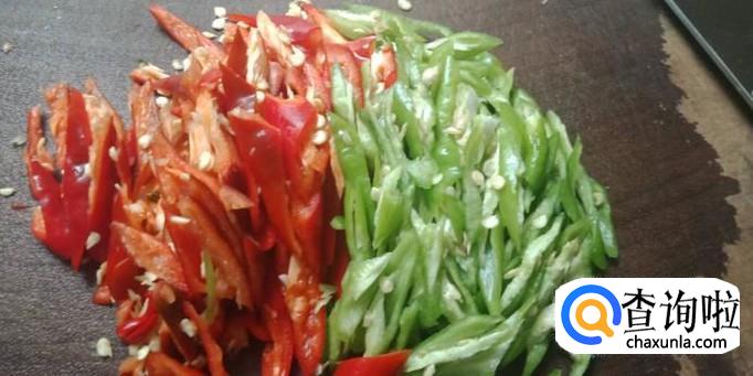青椒和红椒分别清洗干净,分别切成一条一条的,然后就能切成大蒜,切好之后就放在一边备用。
