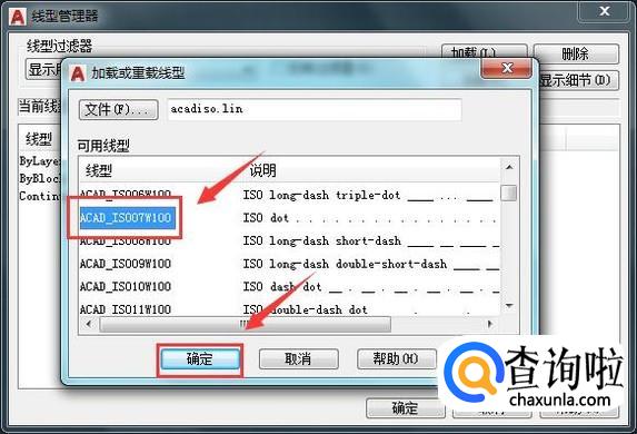点击加载选项在弹出的对话框内选择我们需要使用的线型,然后依次点击确定我们就将该线型加载进来了,如图所示: