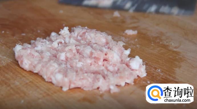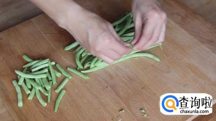 首先,将准备好的四季豆去头去蒂,摘成5公分左右的长段。然后,将猪肉的皮去掉,切成小块,一起剁成肉糜。