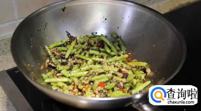 肉变色之后,加入蒜末继续翻炒,然后放入橄榄菜,翻炒均匀后下干辣椒,最后将四季豆放进去一起翻炒。