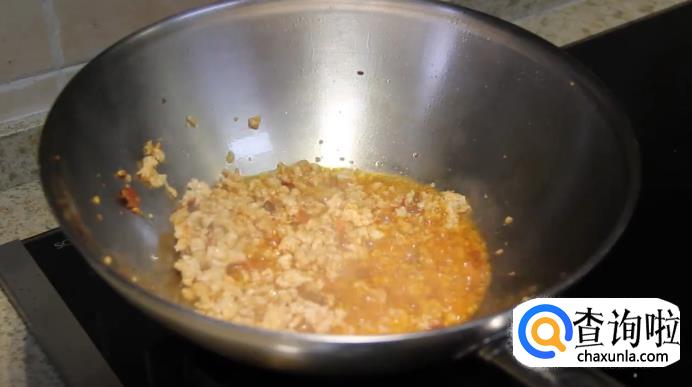 往油锅里下豆瓣酱炒出红油,再加入姜末炒香。接着将肉糜倒入锅中翻炒至变色。