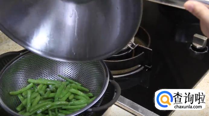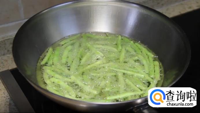 热锅起油,开大火将油烧至6、7成热的时候,将四季豆倒入锅中,开小火炸5分钟左右。炸好后出锅滤油,放在一旁待用。