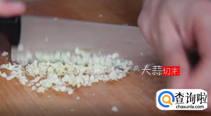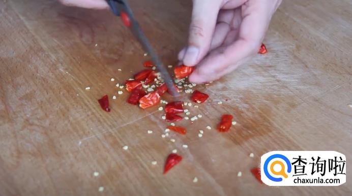 接着,把生姜和大蒜切成末,干辣椒剪成小段,放在一旁待用。