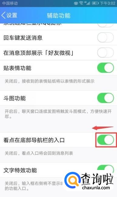 弹出的界面,我们将看点在底部导航栏的入口的开关向左滑动关闭就可以了。这样我们就关闭了QQ看点了。
