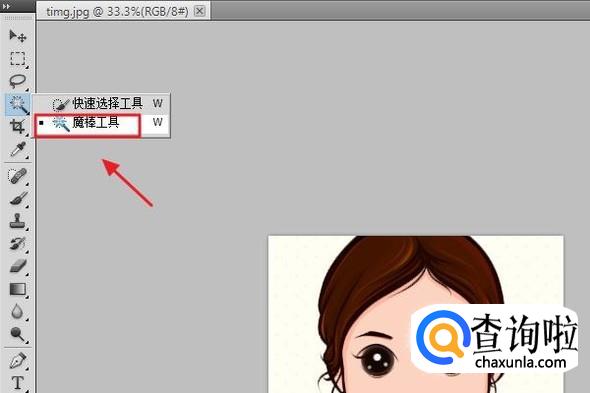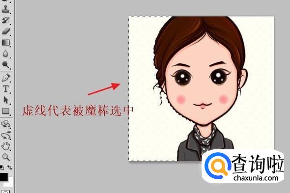 接下来在左侧工具里找到“魔棒工具”,用于快速将人物框选起来,如果照片比较整洁的话,我们直接点选背景部分,此时会有虚线将其围起来,如下图;