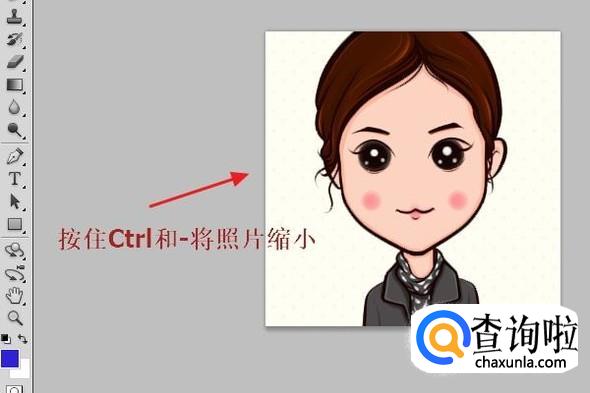 如果素材太大的话,我们可以通过Ctrl+“-”将其缩小一些,不过看上去照片的比例还是有点不太协调,正规的证件照是1寸(尺寸是25mmx35mm)