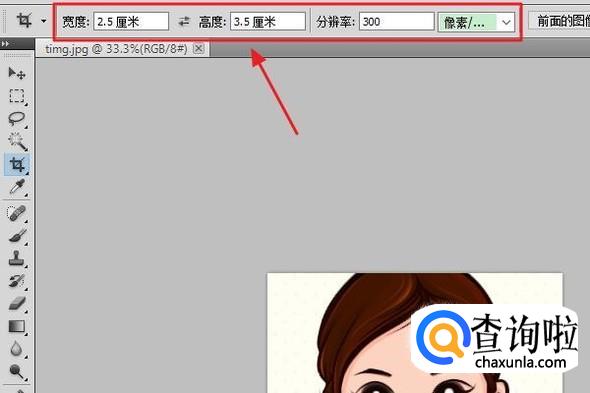 接着在左侧的工具栏找到“裁剪工具”,然后在上方将尺寸设置为25mm和35mm,也就是2.5cmx3.5cm,像素设置为300为宜,如图所示;