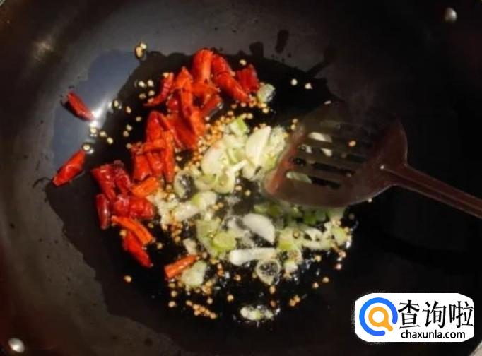 在锅中倒入菜油,烧辣以后将佐料倒进去,煸香。