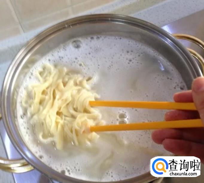 锅里水煮沸,把面条丢进去,熟了以后捞起来,放在碗中。
