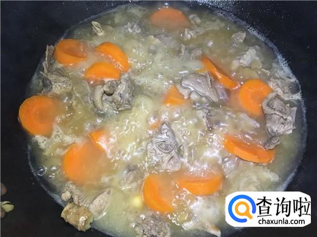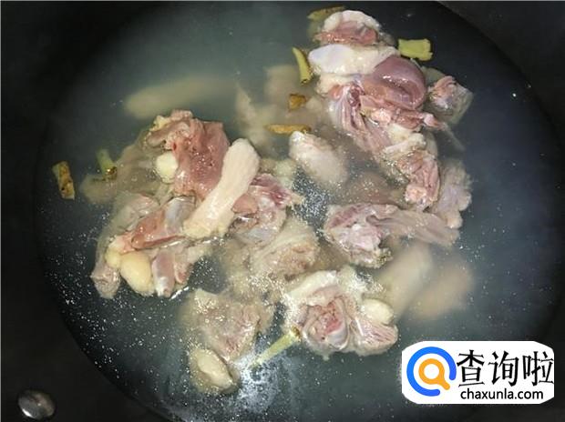锅里烧开一锅水,放入鸭肉烫几分钟,加入少许料酒,去除血水和腥味,再捞起来清洗干净,备用。
