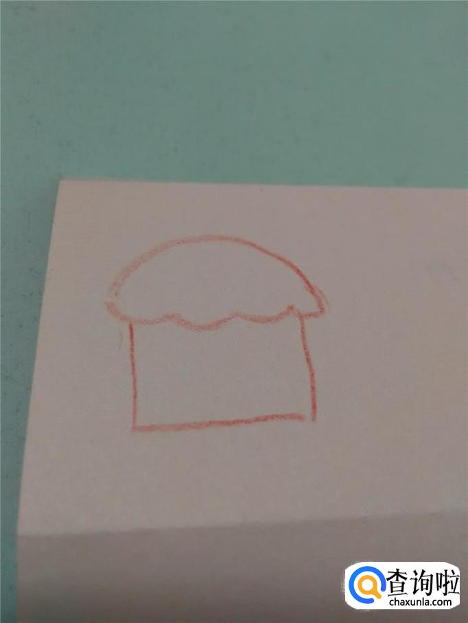 用红笔在彩纸上画一个蛋糕的轮廓,大概像个蘑菇一样。