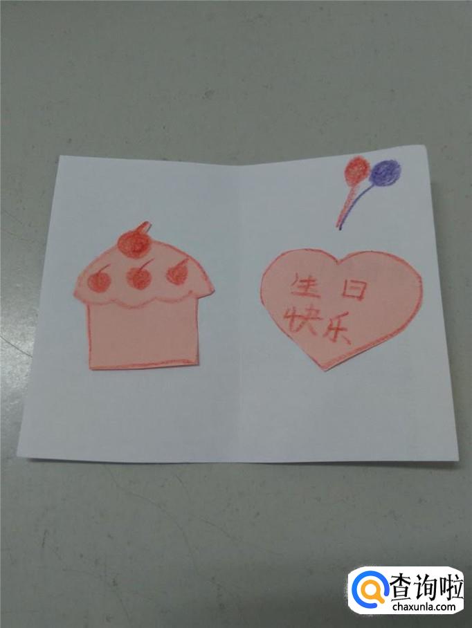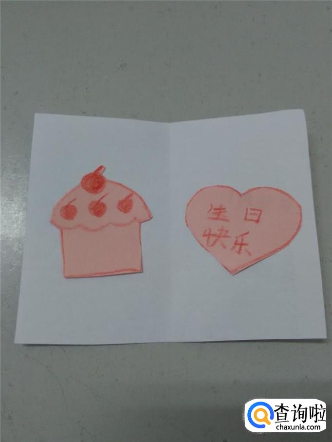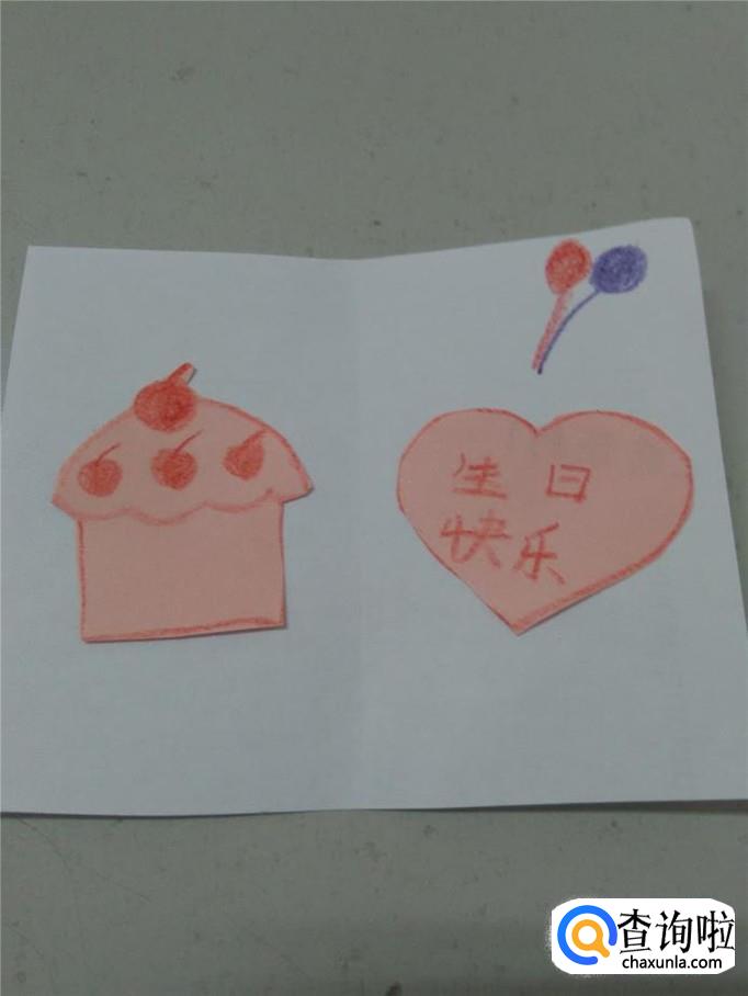 用胶棒把蛋糕和桃心粘在贺卡的左右面上。