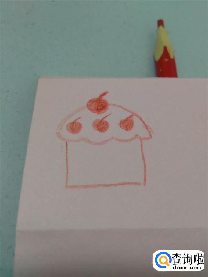 用红笔在蛋糕上半部分画几颗樱桃,其中,最上面的一颗最大。