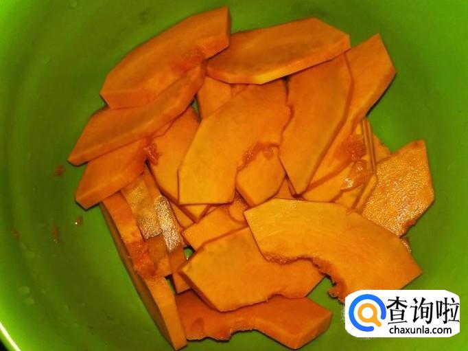 首先把南瓜削皮去籽,然后切成片。