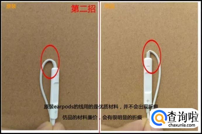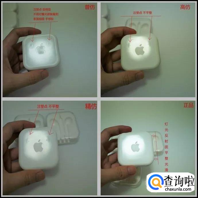 真的 EarPods 包装盒不管是白色的塑料还是透明的盖子,都是平的,像镜子一样。在灯光下观察光源的影子,如果没有发现光源严重扭曲,那么是真货。如果发现光源有明显的圆形扭曲,那么是假货无疑。正品包装盒平滑,边缘圆润,用手摸不会伤手,而仿品包装盒会有毛边,边缘容易割手。