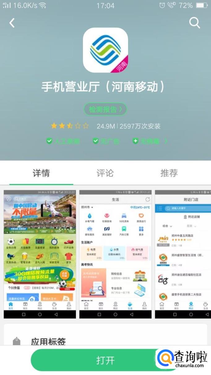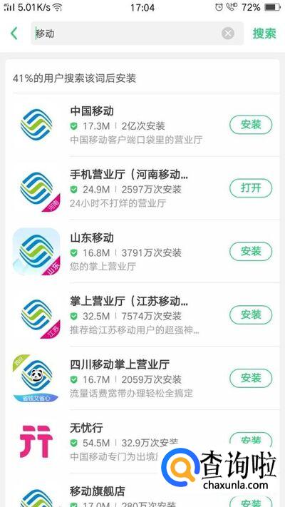 首先在手机软件商店搜索下载“当地的移动APP”,我们以“河南移动”为例。