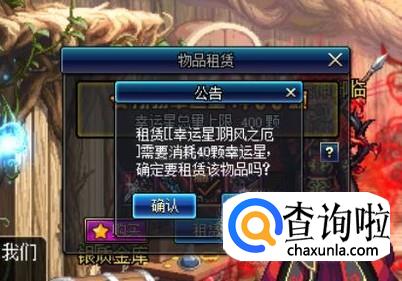 选择完毕后,点击下方的“租赁”按钮,会弹出对应的额租赁公告,点击“确认”按钮,即可成功消耗对应数量的【幸运星】来租赁该武器。