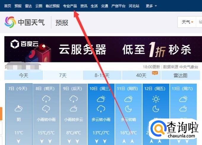 进入“中国天气网”,点击“专业天气”,如图所示。